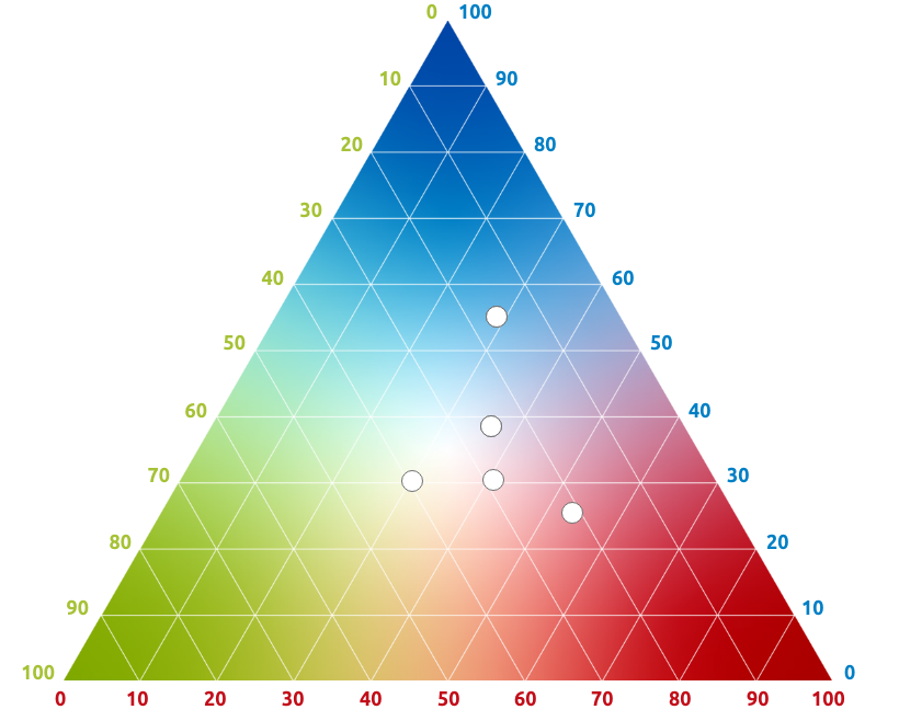 Das Verortungs-Dreieck ist mittels Linien in eine Zehner-Abstufung unterteilt. Die jeweilige Spitze markiert eine Komponentenausprägung von 100%, die gegenüberliegende Seite eine von Null. Das Ergebnis der Analyse lässt sich mit Hilfe der Messlinien problemlos auf die Fläche des Dreiecks übertragen.