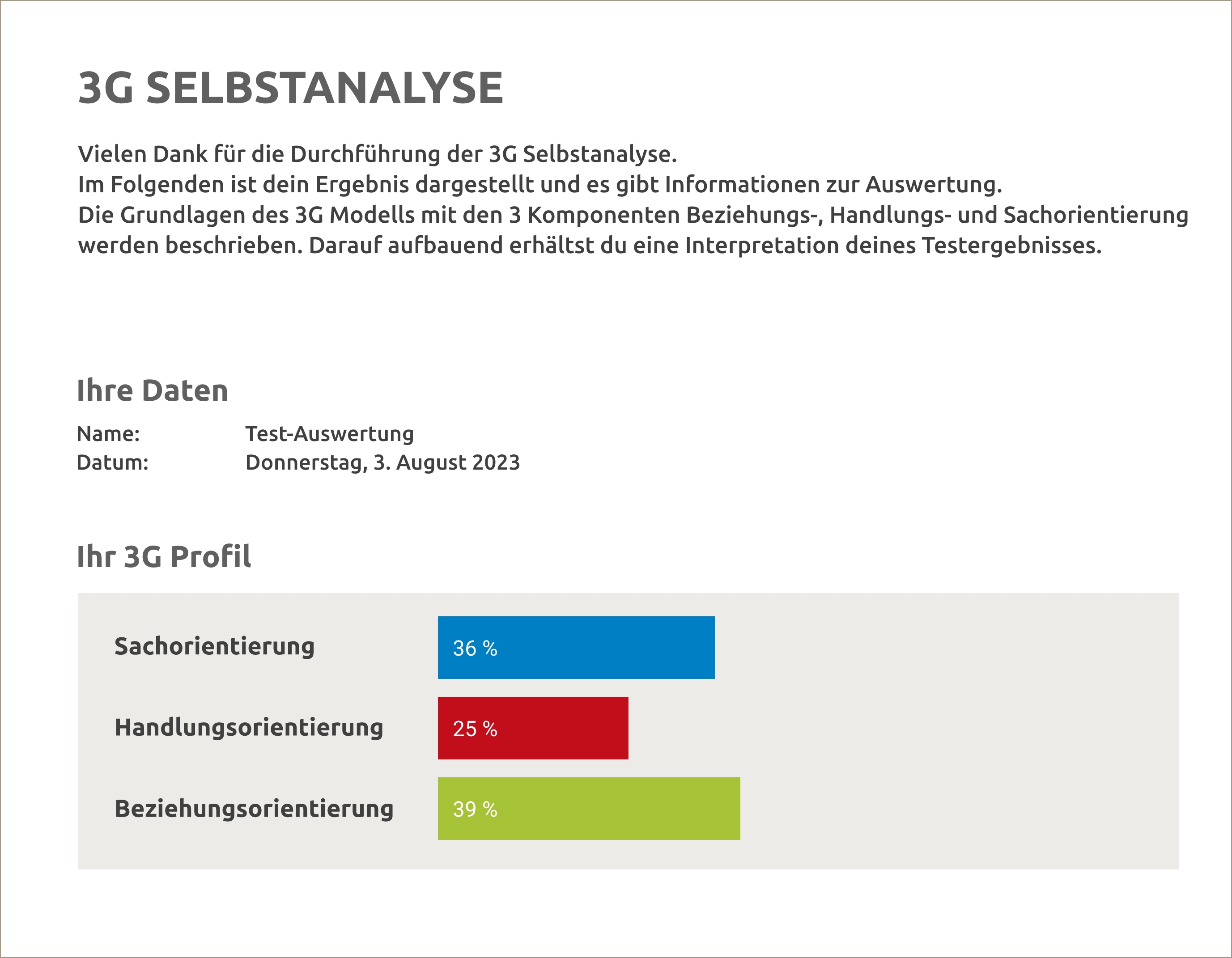 Das Kernelement von 3G® ist der Test zur Selbstanalyse. Er beinhaltet die 3G-relevanten, auf statistischem Weg selektierten Merkmale der Beziehungs-, Handlungs- und Sachorientierung und umfasst 54 Items. Diese werden über eine Selbsteinschätzung auf einer sechsstufigen, metrischen Skala in ihrer individuellen quantitativen Ausprägung bewertet und bringen als Ergebnis das 3G Persönlichkeitsprofil hervor. Das ist die Arbeitsgrundlage für alle Anwendungen von 3G®.